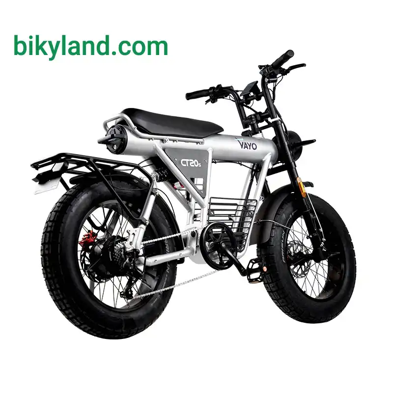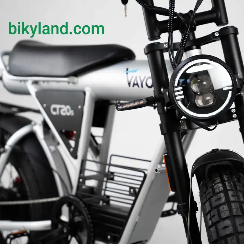 Vayo CT20S از نظر ظاهری کاملاً الهامگرفته از موتورسیکلتهای مدرن است، اما در ساختار فنی همچنان مزایای یک دوچرخه برقی را حفظ میکند.